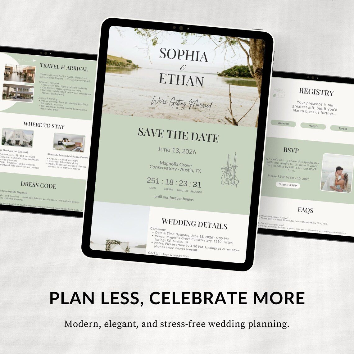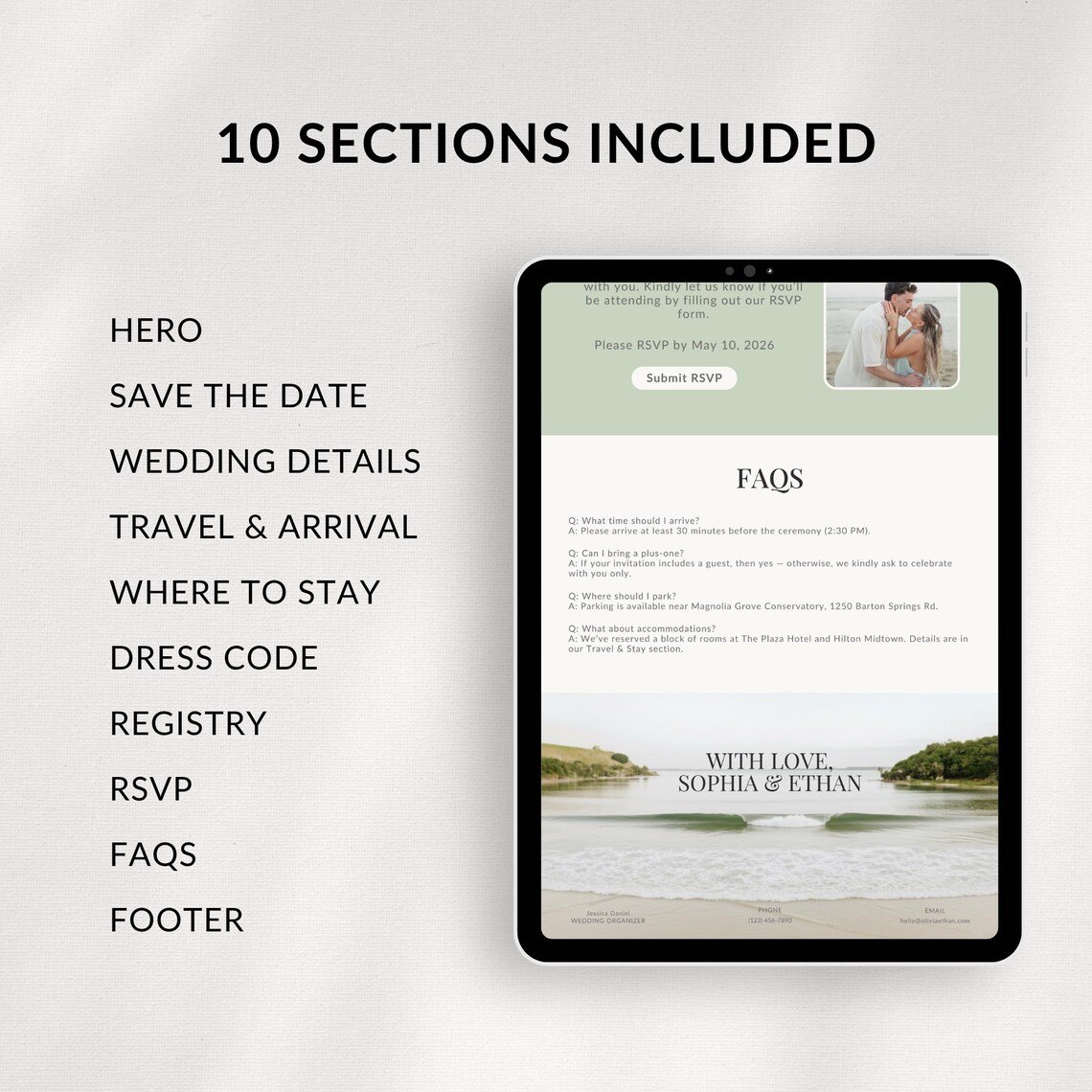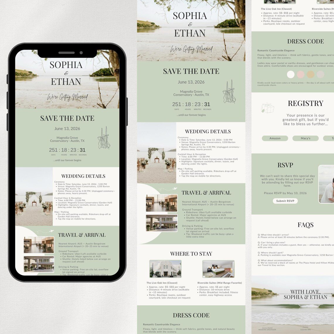 This refined one-page wedding website brings together all essential information — from Save the Date and wedding details to entourage, RSVP, and guest FAQs — in a cohesive layout that looks stunning on any device.
