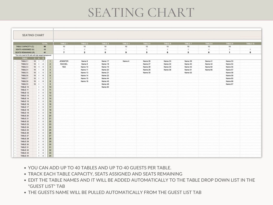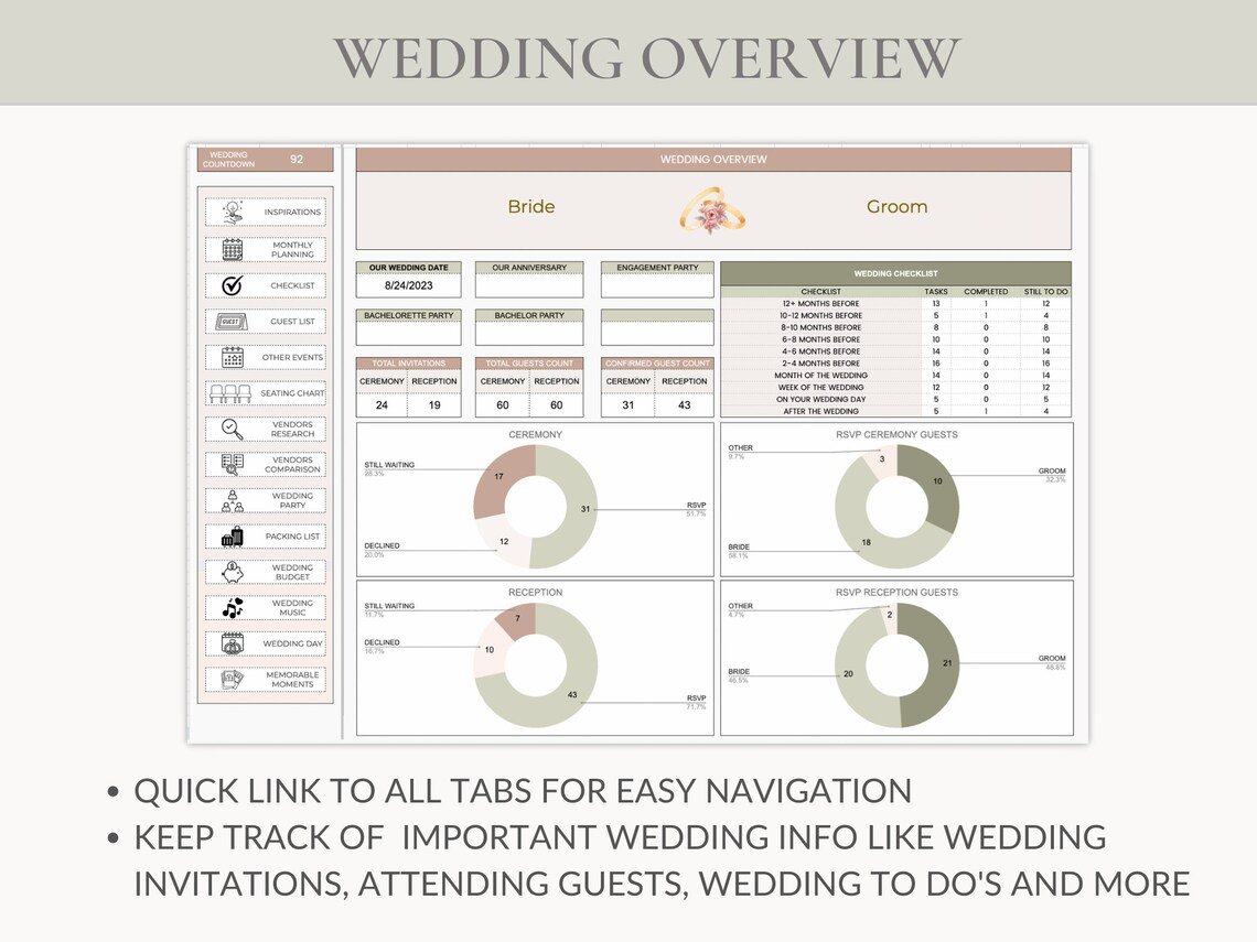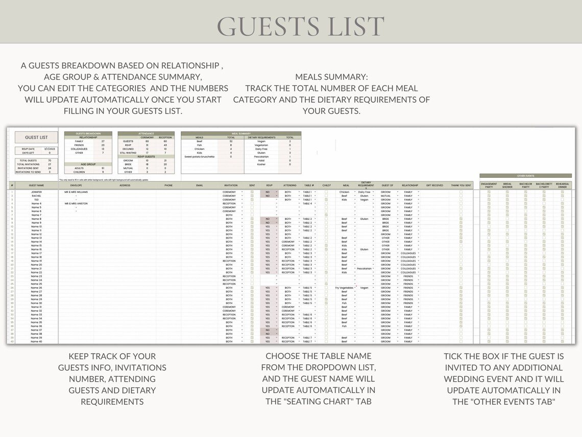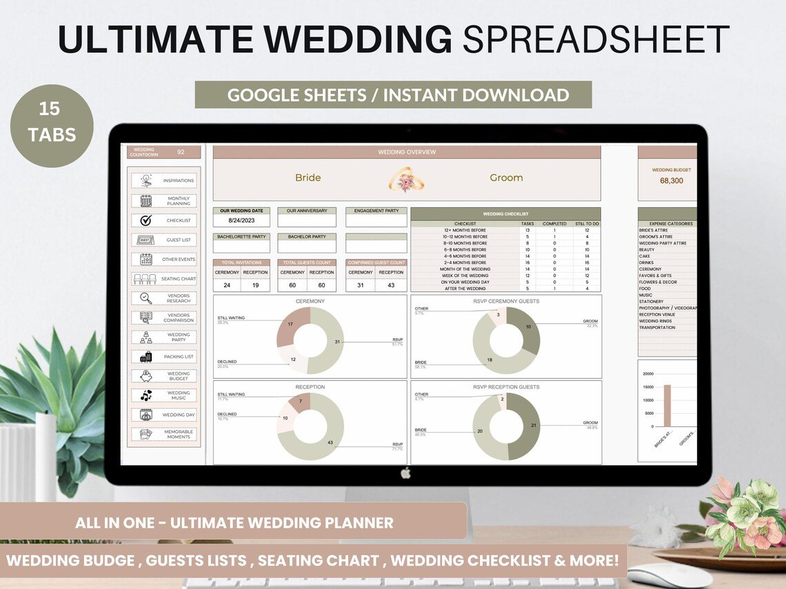 The Ultimate Wedding Planner is an all-in-one Google Sheets spreadsheet designed to help you organise your budget, guest list, seating chart, timeline, vendors, and more with ease.